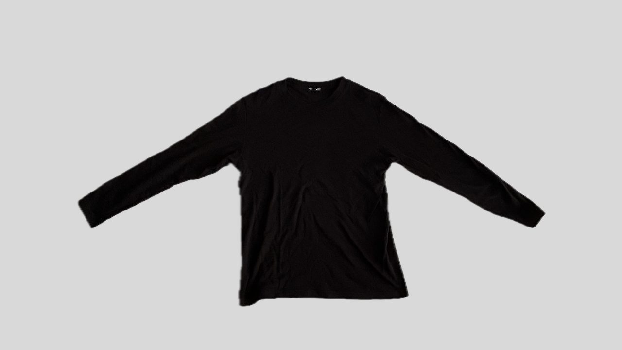 長袖Tシャツも丸首で黒の無地のものを選んでいます。これもGUで購入したものです。これが一番落ち着くし、下手に選んでも失敗するので、これで良いのです。